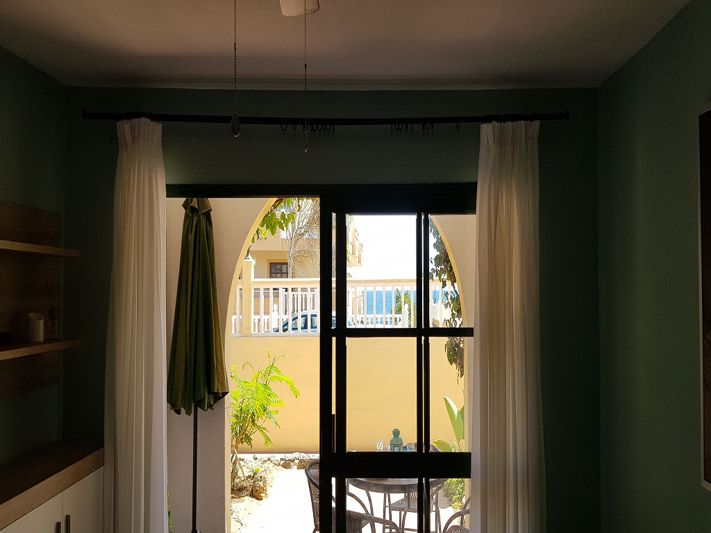 Appartement rez-de-chaussée Bouganville VII à COSTA ANTIGUA – 1 chambre double + 1 canapé lit – Jusqu’à 4 personnes, rez-de-chaussée avec VUE SUR PISCINE, piscine communautaire, terrasse, salon, cuisine, sdb, machine à laver, TV, WIFI – Linges de maison, nettoyage inclus !