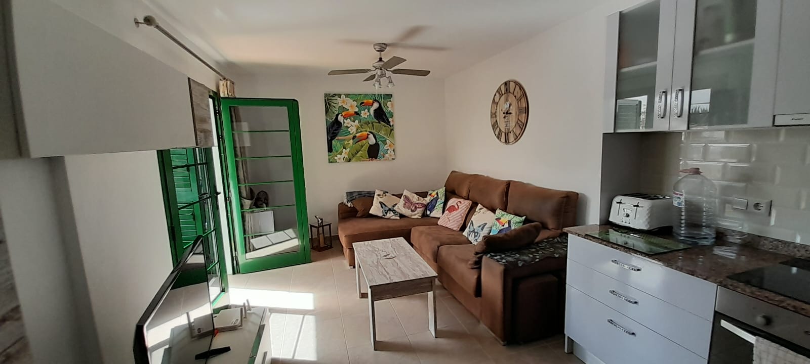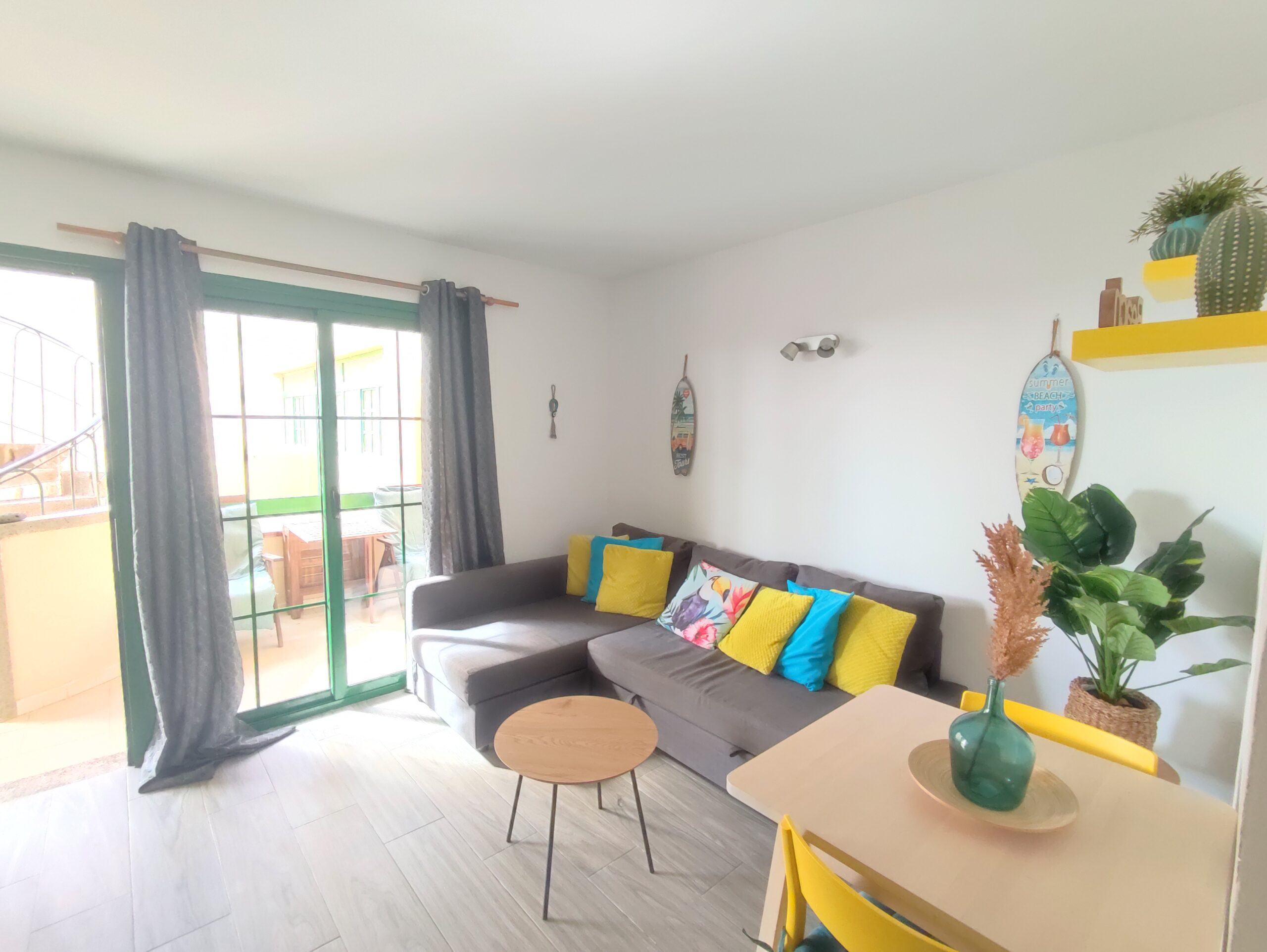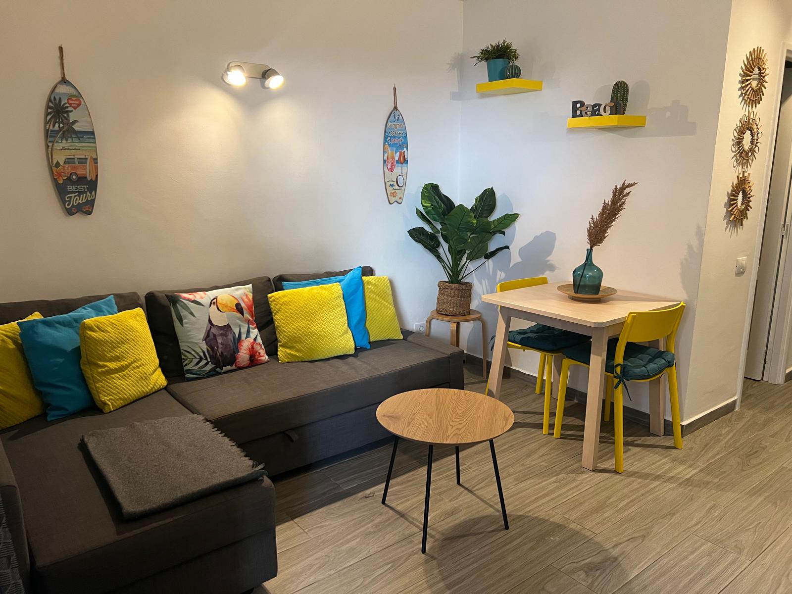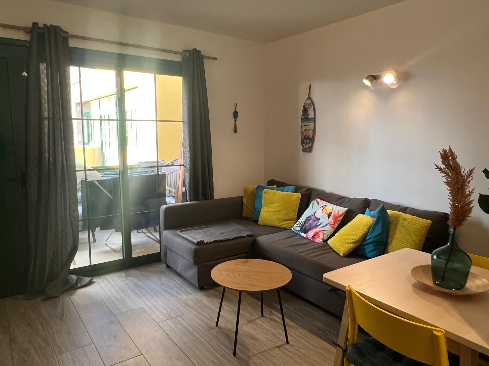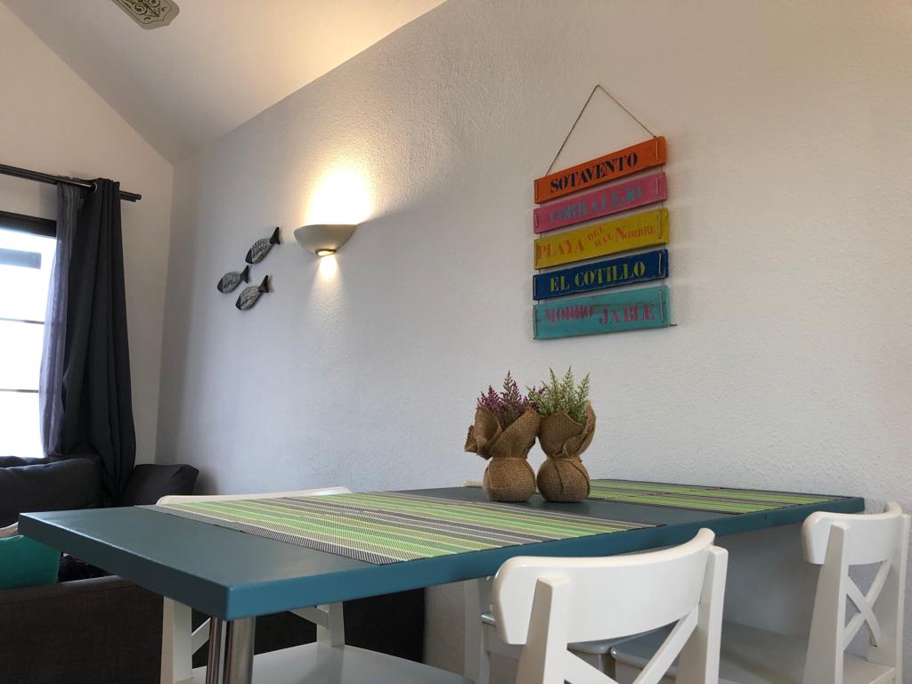Appartement Bouganville I à COSTA ANTIGUA – 1 chambre double + 1 canapé lit – jusqu’à 4 personnes, rez-de-chaussée, entièrement rénové et équipé, piscine communautaire, terrasse, salon, cuisine, sdb, four, machine à laver, TV, WIFI– Linges de maison, nettoyage inclus !